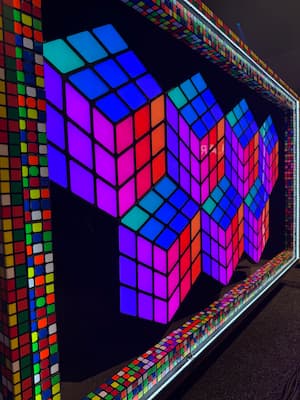 Naast de LED kubussen, zitten in de lijst eromheen ook allemaal echte Rubik’s cubes verlicht, die ook nog uitgelicht worden door LED licht!