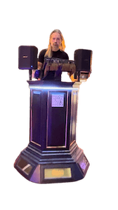 Onze elektrische preekstoel is een vintage katheder omgebouwd tot rijdende DJ booth, letterlijk een rollende DJ.